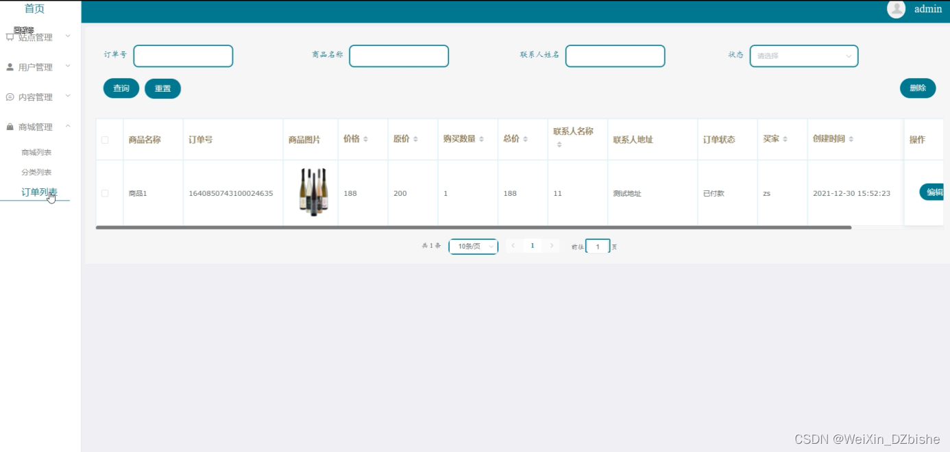 订单管理模块:要求用户在线购买产生的订单信息可以展示在后台,卖家可以对订单信息进行标记审核,表示已接单,并分配物流配送,如果该订单过期或者迟迟没付款,也可以删除该订单的信息。