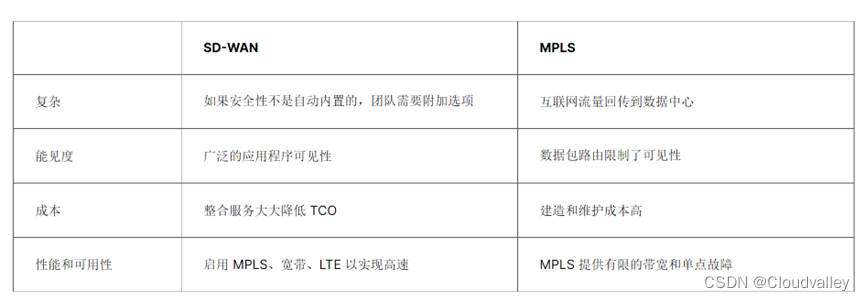 在将组织从传统的 MPLS 配置转移到 SD-WAN 解决方案之前,需要考虑一些因素。那么 SD-WAN 与 MPLS 有什么用处呢?查看下表以比较每个选项: