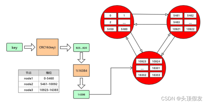 每个key存储时,先经过哈希函数CRC16(key)得到一个整数,然后整数与16384取余,得到槽的数值,然后找到对应的节点,将数据存放入对应的槽中。