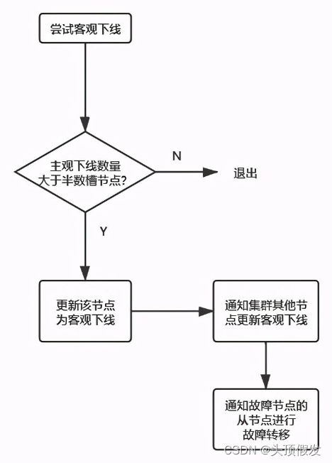 对于每个节点有一个故障列表,故障列表维护了当前节点接收到的其他所有节点的信息。当半数以上的持有槽的主节点都标记某个节点主观下线,就会尝试客观下线。