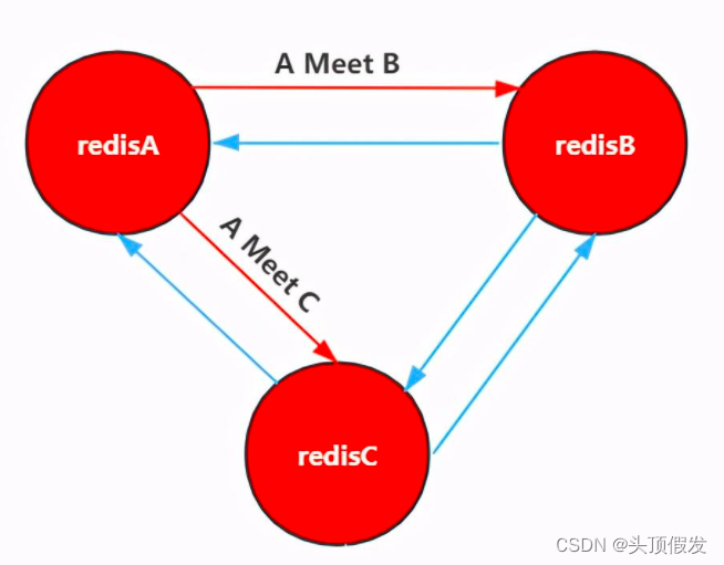- 节点A对节点C发送meet操作,C返回后,A和C之间也能进行沟通。