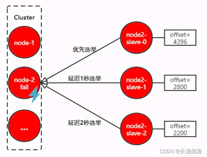 然后是准备选举顺序,不同偏移量的节点,参与选举的顺位不同。offset最大的slave节点,选举顺位最高,最优先选举。而offset较低的slave节点,要延迟选举。