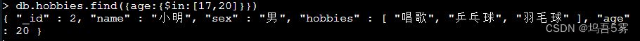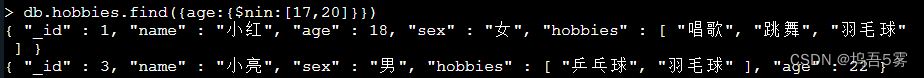 db.hobbies.update({_id:2},{$set:{age:20}}) #添加小明年龄20db.hobbies.update({_id:3},{$set:{age:22}}) #添加小亮年龄22