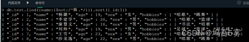 name != 韩*开头的人的信息,并按照_id升序排序;执行查询命令,查找查找