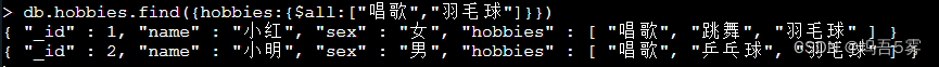 db.hobbies.find({hobbies:{$all:["唱歌","羽毛球"]})