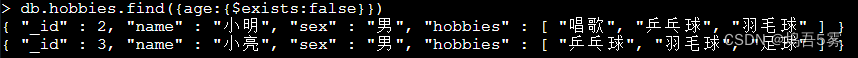 - 查询 hobbies 集合中存在 age 字段的文档,如图所示:
