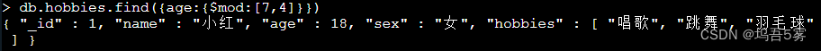 db.hobbies.save({_id:1,name:"小红",age:18,sex:"女",hobbies:["唱歌","跳舞","羽毛球"]}) #添加小红年龄18