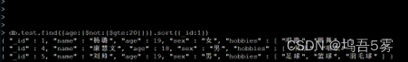 19 =< age < 22的人的信息,并按照_id升序排序;执行查询命令,查找年龄