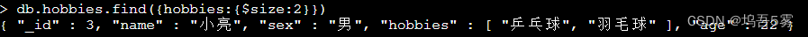 可以查询特定长度的数组,比如 hobbies 这一字段,查询有两个爱好的文档: