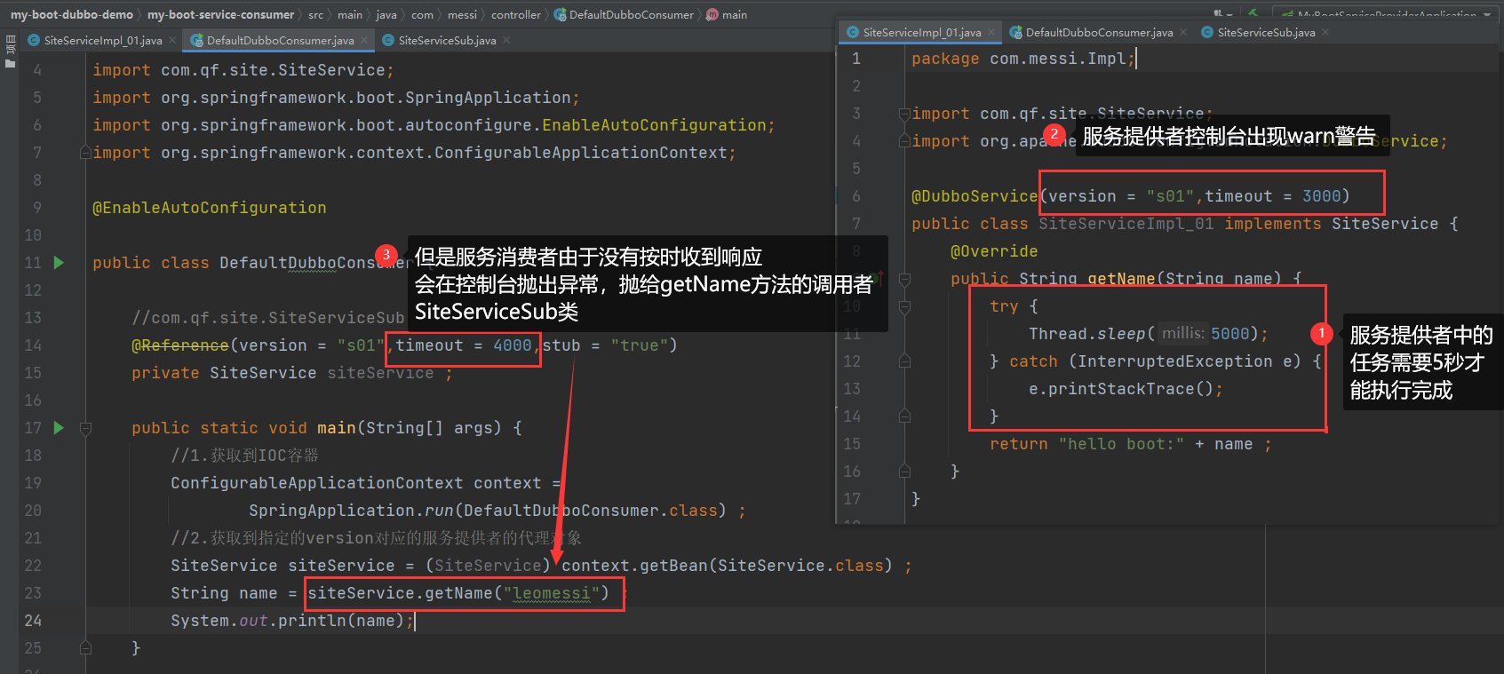 1.只在服务提供者和消费者二者中的一个进行配置timeout超时时间。那么最终的效果为:该超时时间会在二者中都生效 !