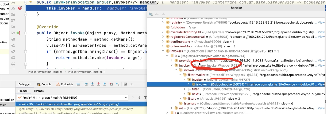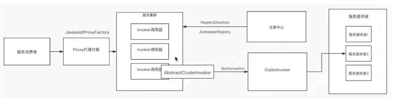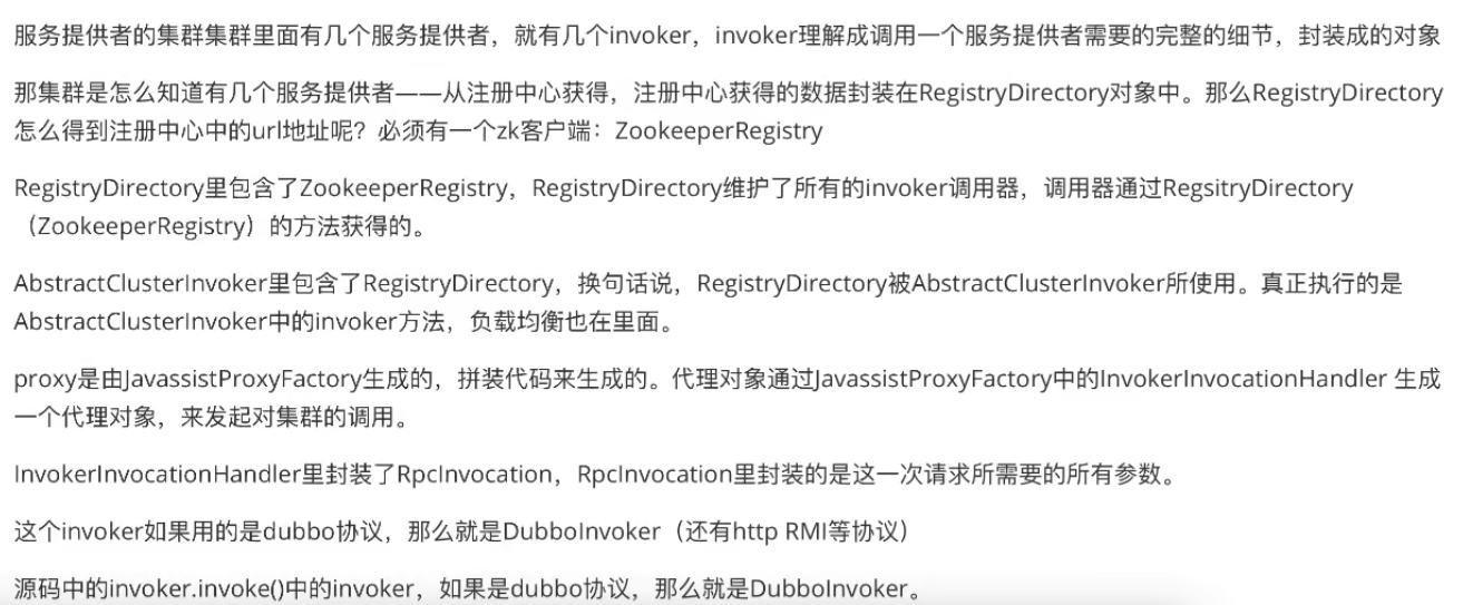 如果注册中心为Zookeeper,那么RegistryDirectory类内部会进行封装一个ZookeeperRegistry,ZookeeperRegistry进行真正作用拿到invoker调用器