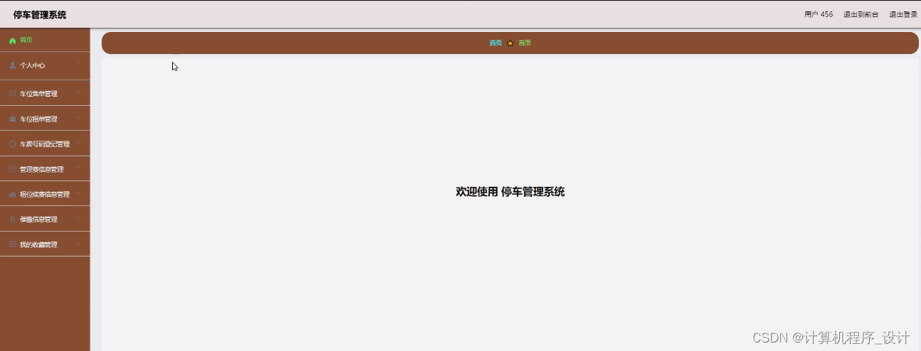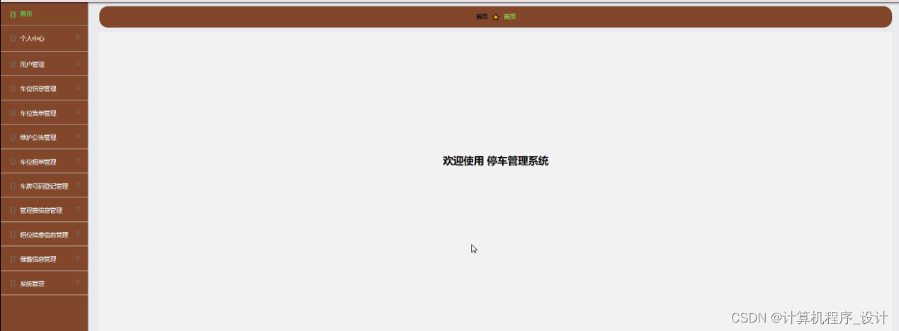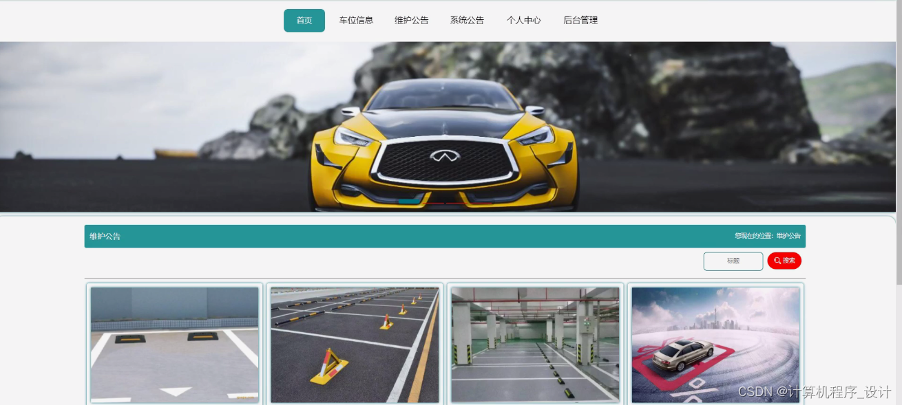 车库收费管理系统,在系统首页可以查看首页、车位信息、维护公告、系统公告、个人中心、后台管理等内容,如图5-1所示。