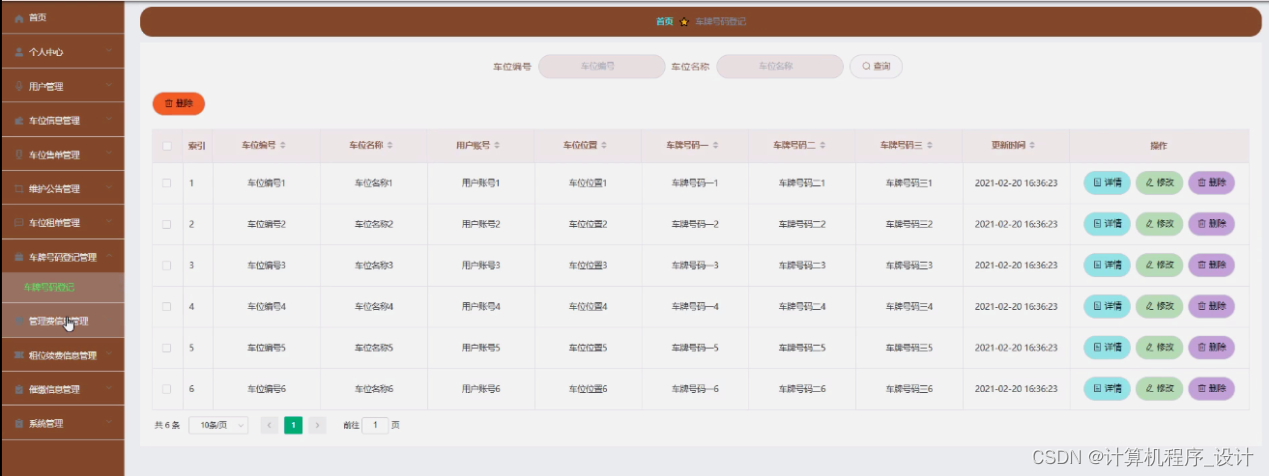车牌号码登记管理,在车牌号码登记管理页面中可以查看索引、车位编号、车位名称、用户账号、车位位置、车牌号码一、车牌号码二、车牌号码三、更新时间等内容,并且根据需要进行修改或删除等详细操作,如图5-12所示。