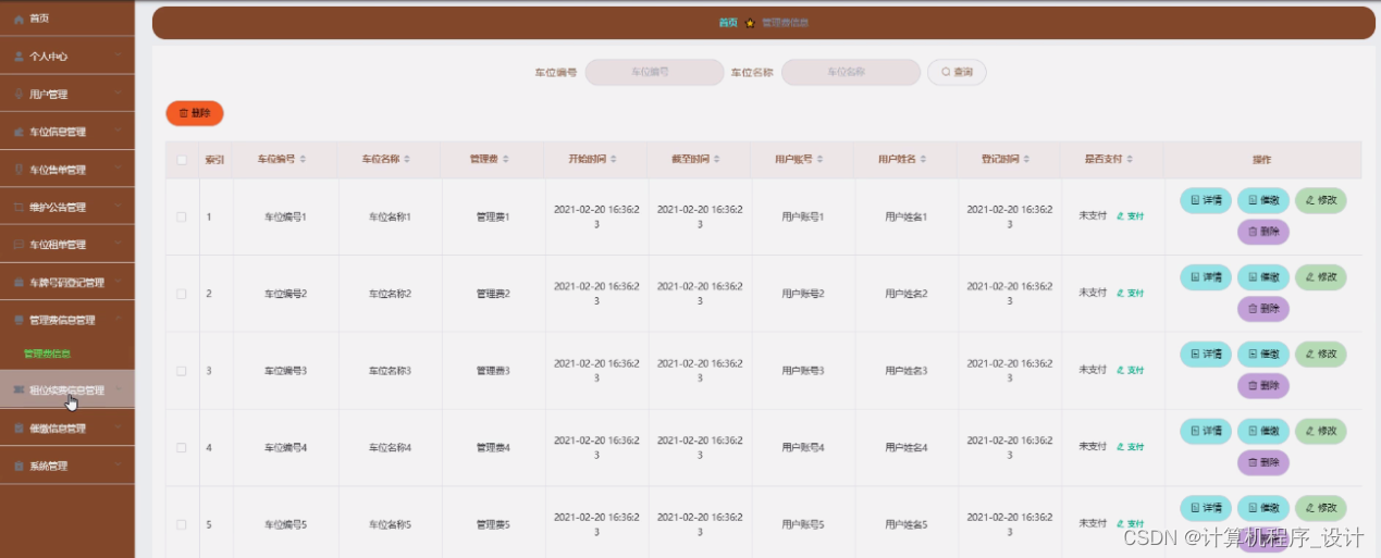管理费信息管理,在管理费信息管理页面中可以查看索引、车位编号、车位名称、管理费、开始时间、截至时间、用户账号、用户姓名、登记时间、是否支付等信息,并可根据需要进行详情、催缴、修改或删除等详细操作,如图5-13所示。