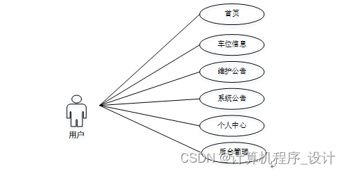 (2)用户:首页、车位信息、维护公告、系统公告、个人中心、后台管理等功能,用户用例图如图3-2所示。