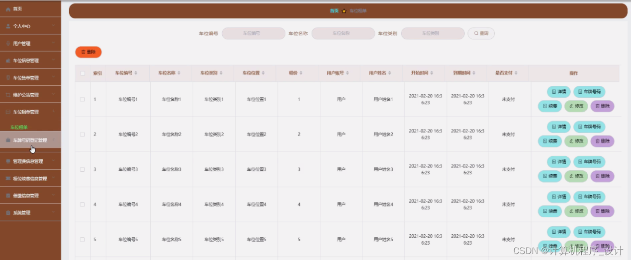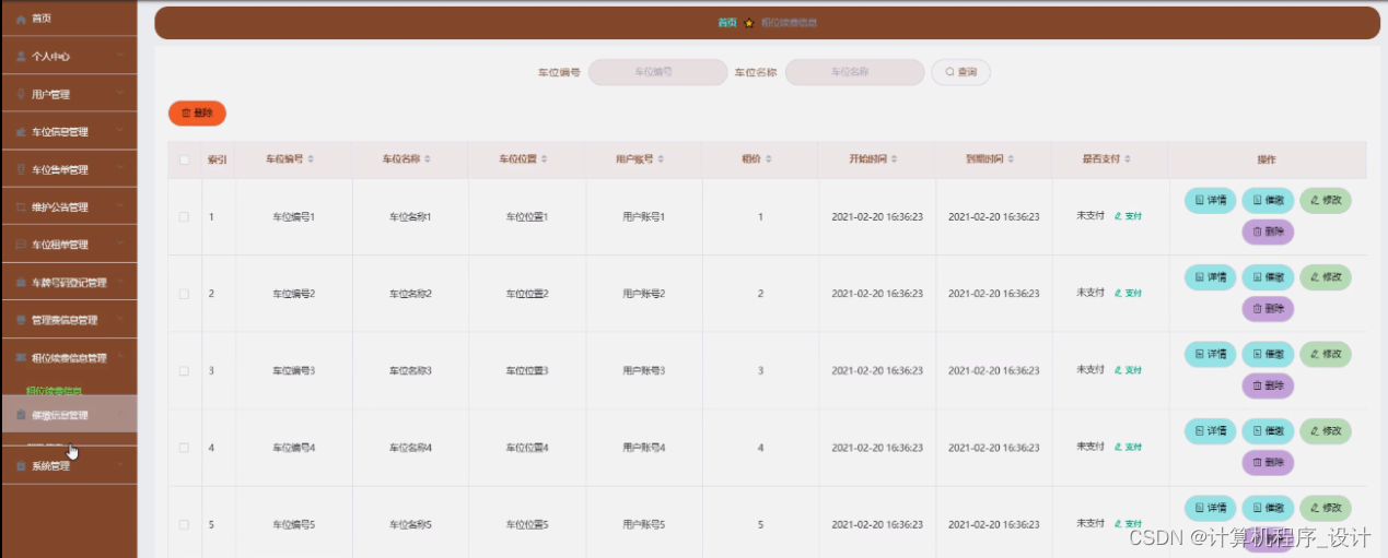 车位租单管理,在车位租单管理页面中可以查看索引、车位编号、车位名称、车位类别、车位位置、租价、用户账号、用户姓名、开始时间、到期时间、是否支付等信息,并可根据需要进行详情、车牌号码、续费、修改或删除等详细操作,如图5-11所示。