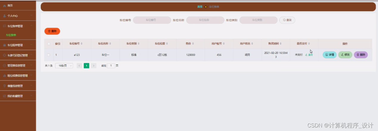 车位售单管理,在车位售单管理页面中可以查看索引、车位编号、车位名称、车位类别、车位位置、售价、用户账号、用户姓名、购买时间、是否支付等信息,并可根据需要进行详情、修改或删除等详细操作,如图5-18所示。
