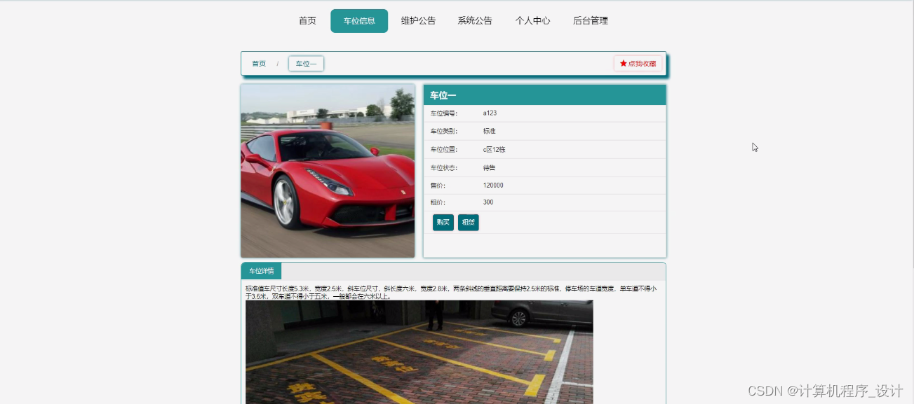 车位信息,在车位信息页面可以查看位编号、车位名称、车位类型、车位图片、车位位置、车位状态、售价、租价、车位详情等详细内容进行购买、租赁或收藏,如图5-2所示。