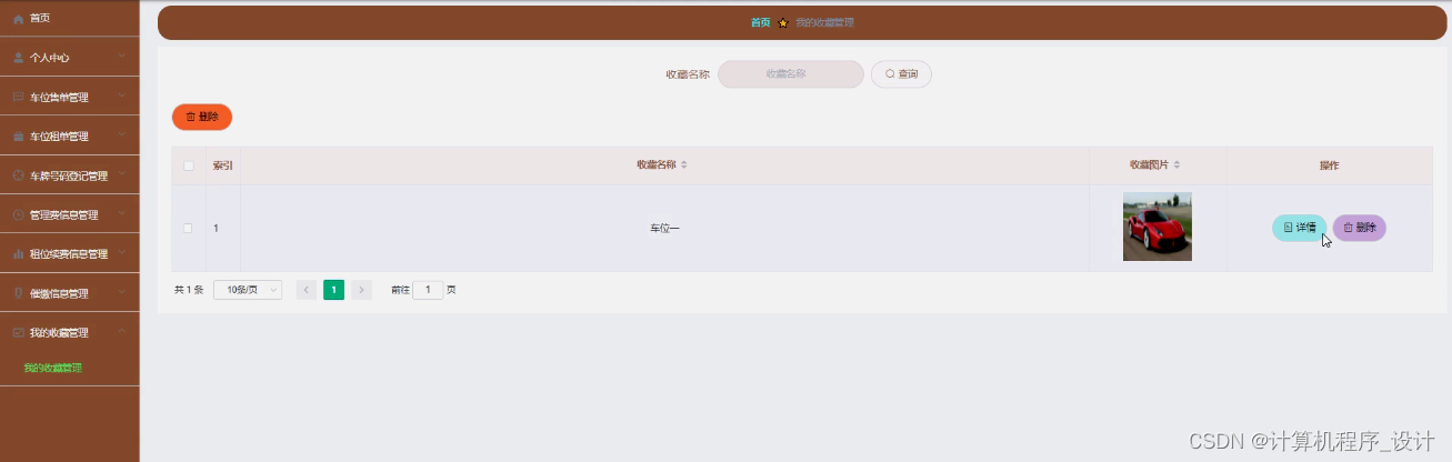 我的收藏管理,在我的收藏管理页面中可以查看索引、收藏名称、收藏图片等内容,并且根据需要进行详情或删除等详细操作,如图5-20所示。