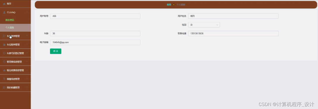 个人中心,在个人中心页面中通过填写用户账号、用户姓名、年龄、性别、联系电话、电子邮箱等信息进行修改,如图5-17所示。