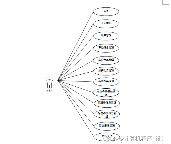 1)管理员模块:系统中的核心用户是系统管理员,管理员登录后,通过管理员菜单来管理后台系统。主要功能有:首页、个人中心、用户管理、车位信息管理、车位售单管理、维护公告管理、车位租单管理、车牌号码登记管理、管理费信息管理、租位续费信息管理、催缴信息管理、系统管理等功能。管理员用例图如图3-1所示。