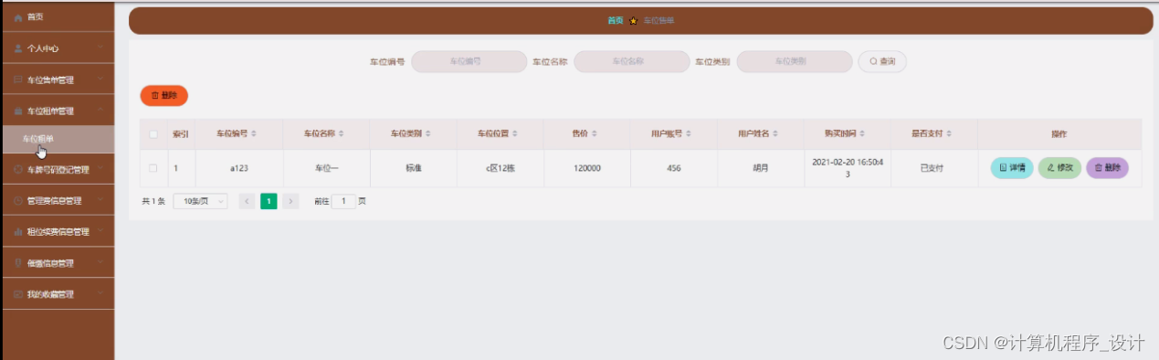 车位租单管理,在车位租单管理页面中可以查看索引、车位编号、车位名称、车位类别、车位位置、租价、用户账号、用户姓名、开始时间、到期时间、是否支付等信息,并可根据需要进行详情、修改或删除等详细操作,如图5-19所示。