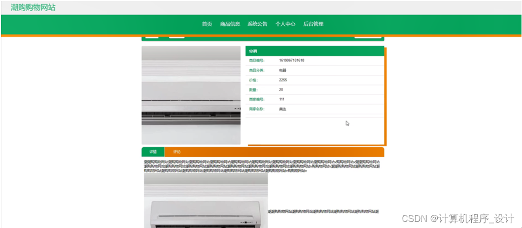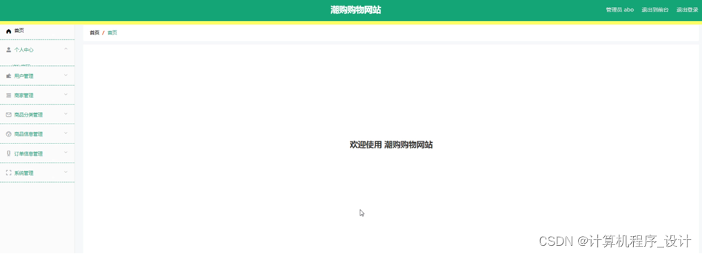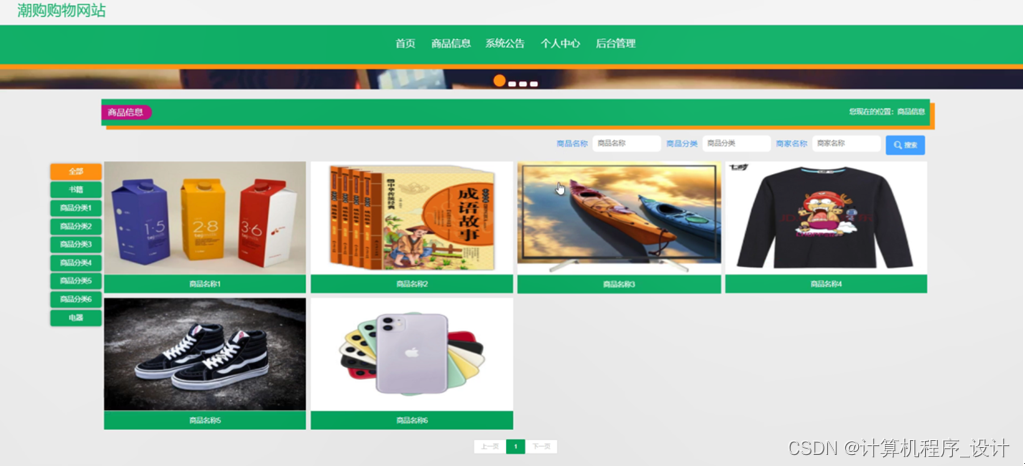 潮购购物网站,在系统的首页可以查看首页、商品信息、系统公告、个人中心、后台管理等信息进行详细操作,如图5-1所示。