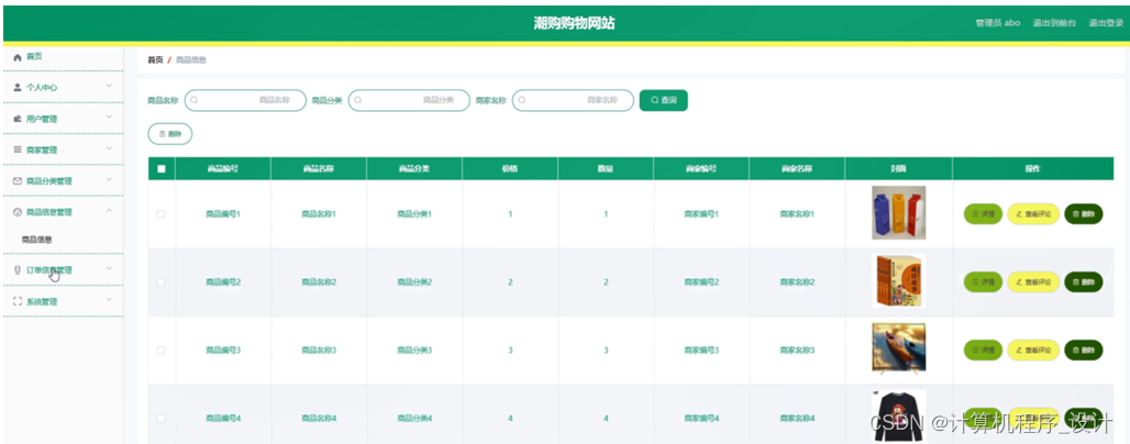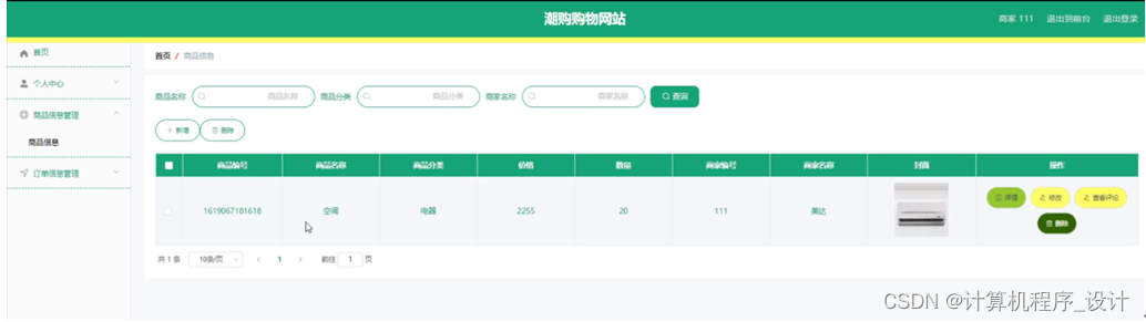 商品信息管理,在商品信息管理页面中可以对商品编号、商品名称、商品分类、价格、数量、商家编号、商家名称、封面等信息进行详情、查看评论或删除等操作,如图5-9所示。