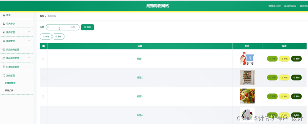 系统管理,在系统公告页面中可以对标题、图片等信息进行详情、修改或删除等操作,还可以根据需要对轮播图管理进行详细操作;如图5-11所示。