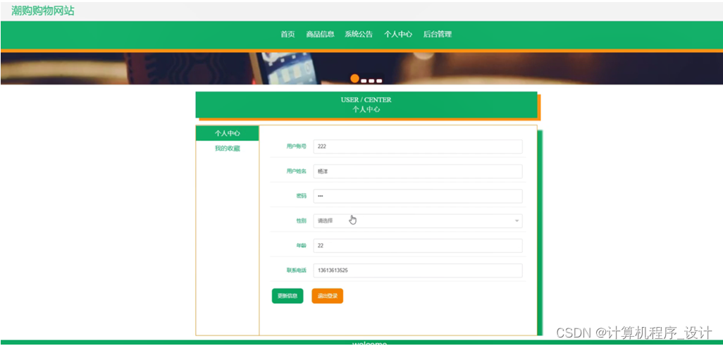 个人中心,在个人中心页面通过填写用户账号、用户姓名、密码、性别、年龄、联系电话等信息完成个人信息更新操作,还可以根据需要对我的收藏进行详细操作;如图5-3所示。