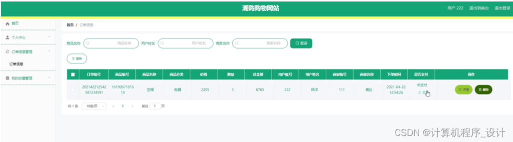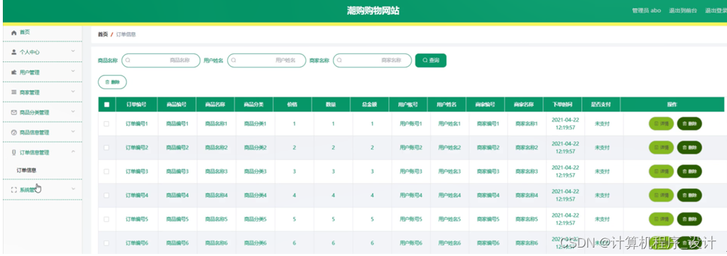 订单信息管理,在订单信息管理页面中可以对订单编号、商品编号、商品名称、商品分类、价格、数量、总金额、用户账号、用户姓名、商家编号、商家名称、下单时间、是否支付等信息进行详情或删除等操作,如图5-10所示。