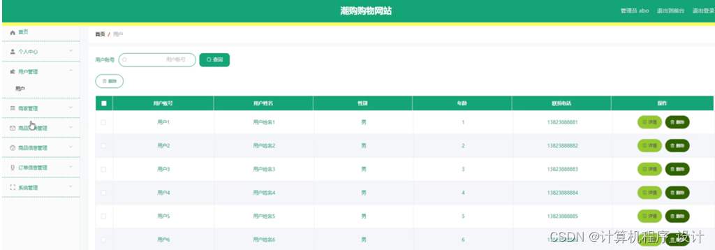 用户管理,在用户管理页面中可以对用户账号、用户姓名、性别、年龄、联系电话等信息进行详情或删除等操作,如图5-6所示。
