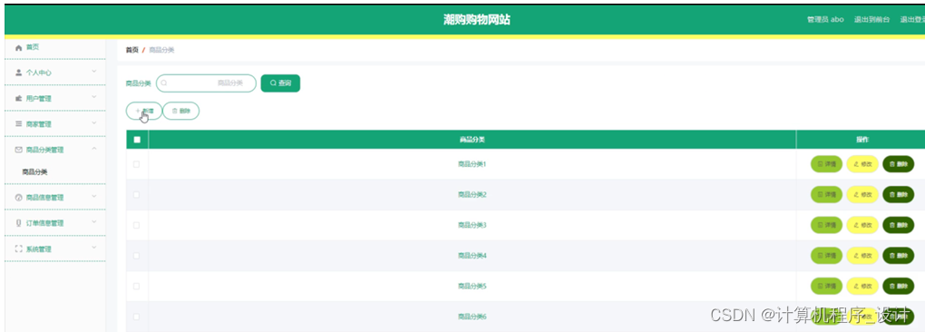 商品分类管理,在商品分类管理页面中可以对商品分类信息进行详情,修改或删除等操作,如图5-8所示。