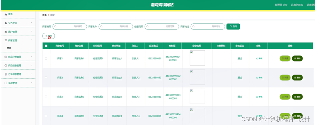 商家管理,在商家管理页面中可以对商家编号、商家名称、经营范围、商家地址、负责人、联系电话、身份证、企业执照、审核回复、审核状态、审核等信息进行详情或删除等操作,如图5-7所示。