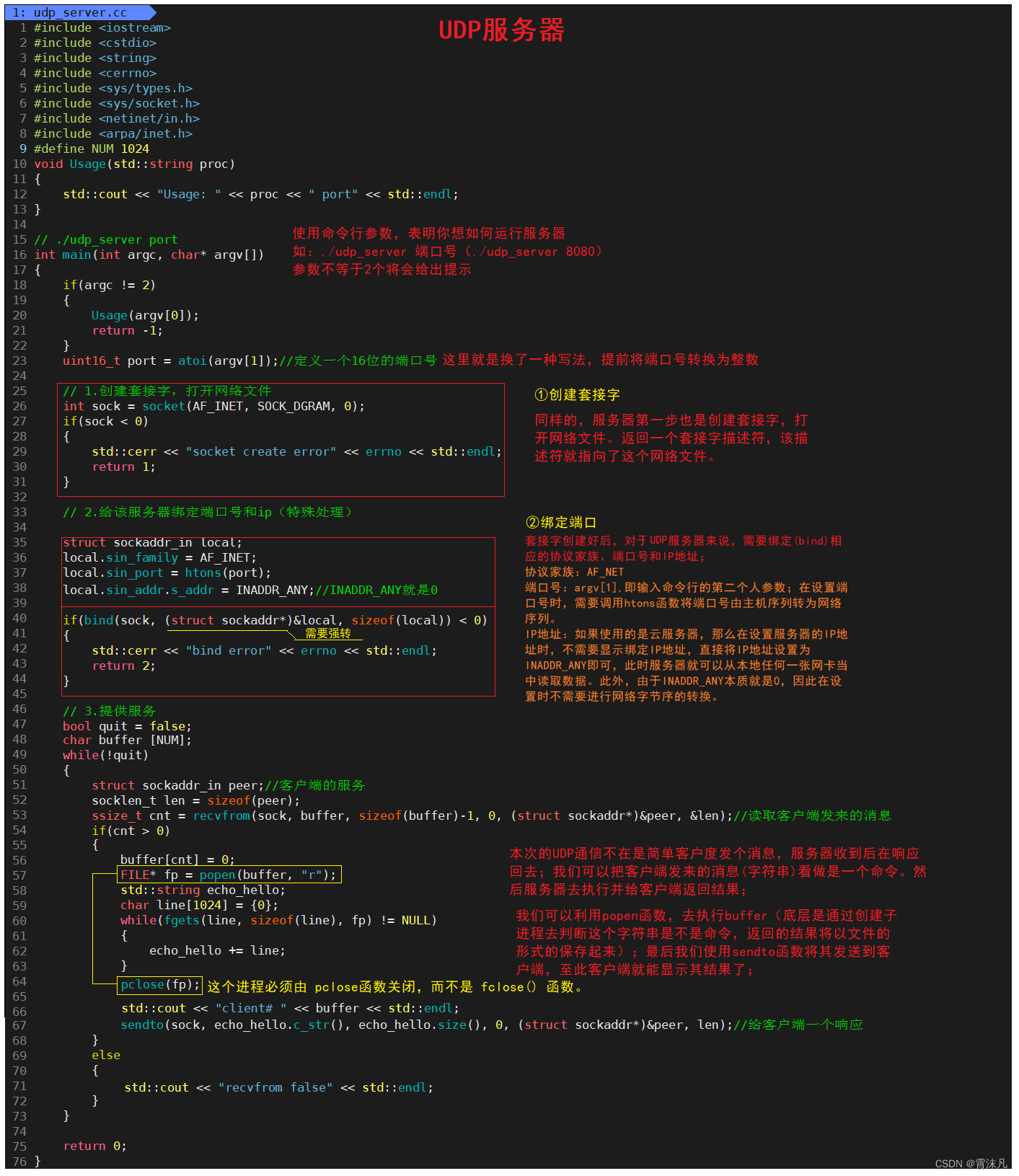 ssize_t cnt = recvfrom(sock, buffer, sizeof(buffer)-1, 0, (struct sockaddr*)&peer, &len);//读取客户端发来的消息