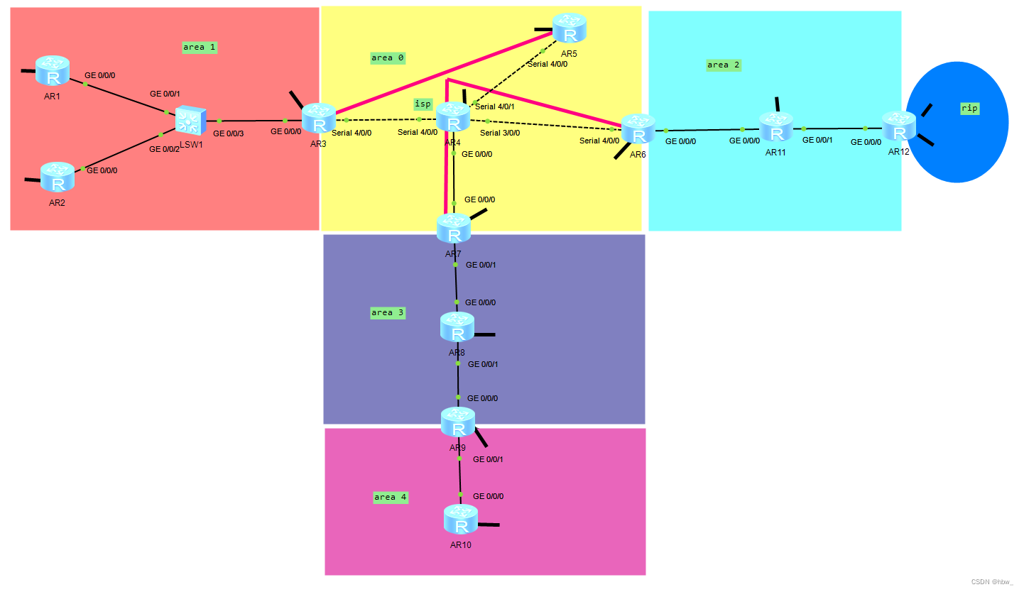 4、所有设备均有一条环回接口,R3环回在area1中宣告,R6 R7环回在area1中宣告,所有设备均 可访问R4环回;