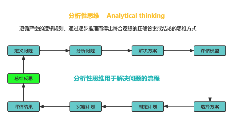 分析性思维(Analytical Thinking)属于逻辑性、理性、科学性的思维方式,也可以说是“纵向思维”——根据逻辑不断深入问题的一种思维方式。是以一次前进一步为特征。包括归纳推理、演绎推理、证明等逻辑思维。是指经过仔细研究、逐步分析,最后得出明确结论的思维方式。