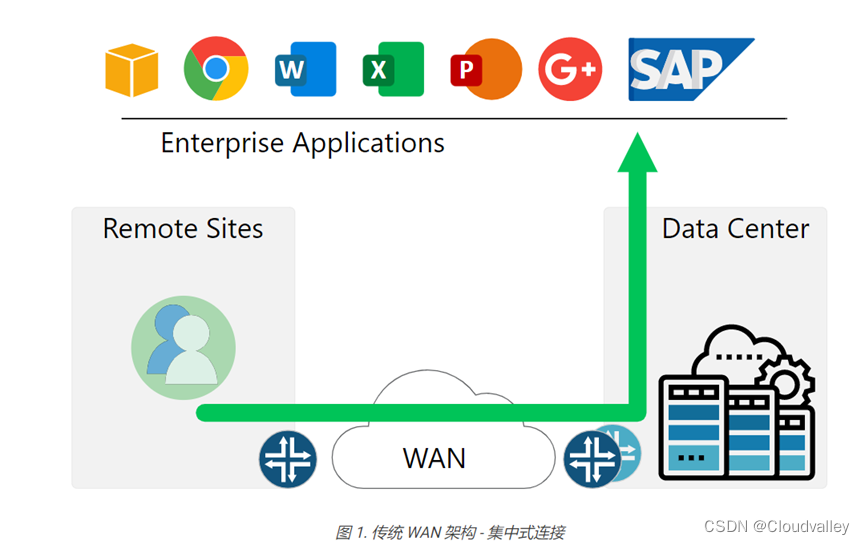 近年来,企业接受数字化转型的速度比以往任何时候都快。远程工作和在线会议现在已成为标准。许多应用程序已迁移到公共云,许多服务现在可以通过 Internet 获得。公司希望降低成本并更有效地管理其基础架构。然而, 传统的广域网 (WAN) 旨在将远程站点的用户连接到公司数据中心托管的应用程序。专用租用线路和 MPLS 电路用于为数据中心提供安全可靠的连接。虽然现在一些应用程序在公共云和互联网中,但来自远程站点的流量必须先到达数据中心,然后再路由到公共云再返回。这个概念如图 1 所示。