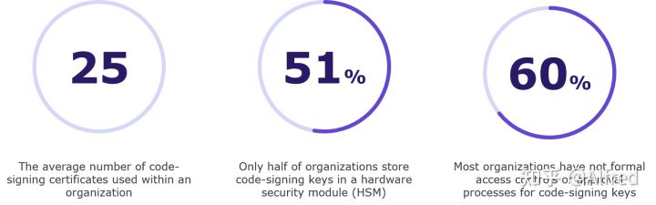 在最近的一項研究中,我們發現公司平均擁有 25 個代碼簽名證書。 大約 51% 的受訪者表示他們將相關的私鑰存儲在硬件安全模塊 (HSM) 中。 另一方面,許多人表示在構建服務器 (33%) 和開發人員工作站 (19%) 上也發現了私鑰,近三分之二 (60%) 的公司沒有正式的訪問控制和代碼審批流程—— 簽名密鑰。