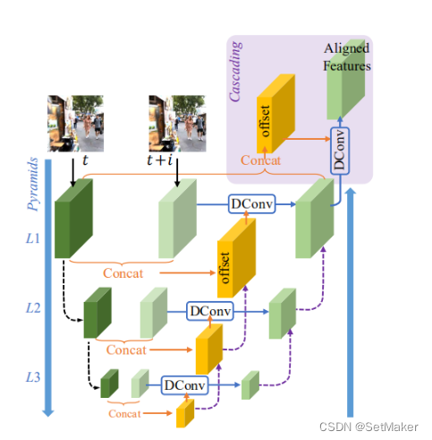 PCD模块受到TDAN的启发,使用可变形卷积将每个相邻帧与特征级别的参考帧对齐。与TDAN不同,我们以粗到细的方式执行对齐以处理大而复杂的运动。具体来说,我们使用金字塔结构,首先将较低比例的特征与粗略估计对齐,然后将偏移和对齐特征传播到更高比例以促进精确的运动补偿,类似于光流估计中采用的概念。此外,我们在锥形对准操作之后级联另外的可变形卷积,以进一步提高对准的稳健性。如图: