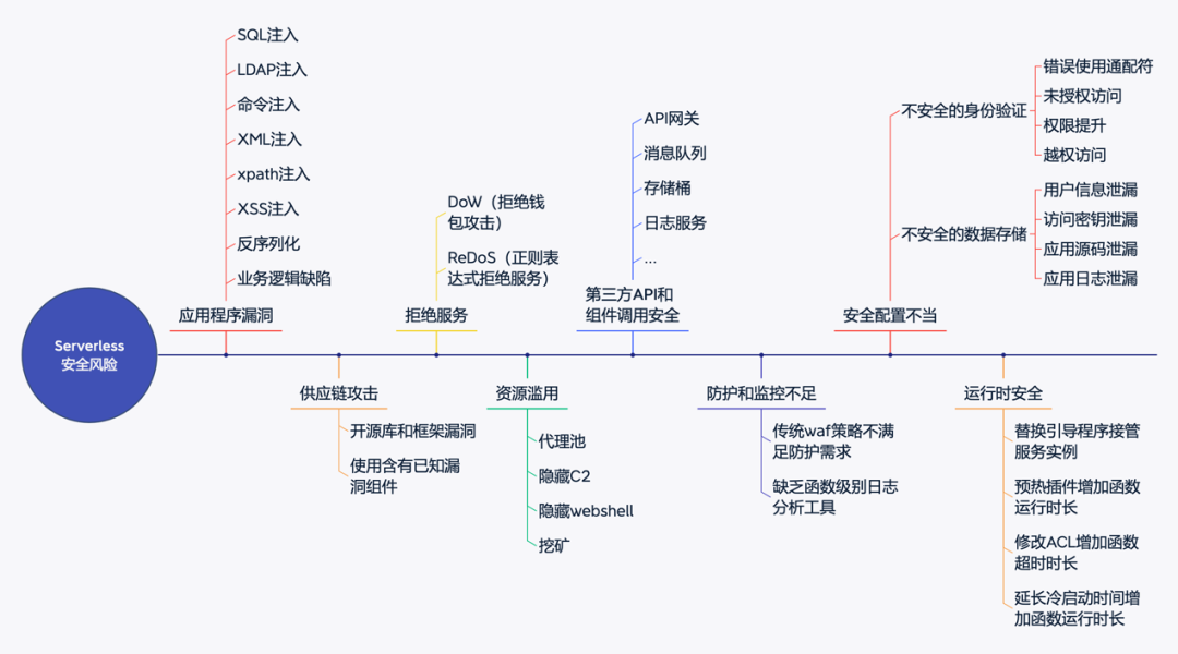 腾讯安全云鼎实验室根据自身安全实践,结合国内外众多相关案例,总结出了Serverless常见风险项,用以帮助开发以及运维人员识别各类风险,从而有效的保障Serverless应用安全。主要安全风险可参照下图:
