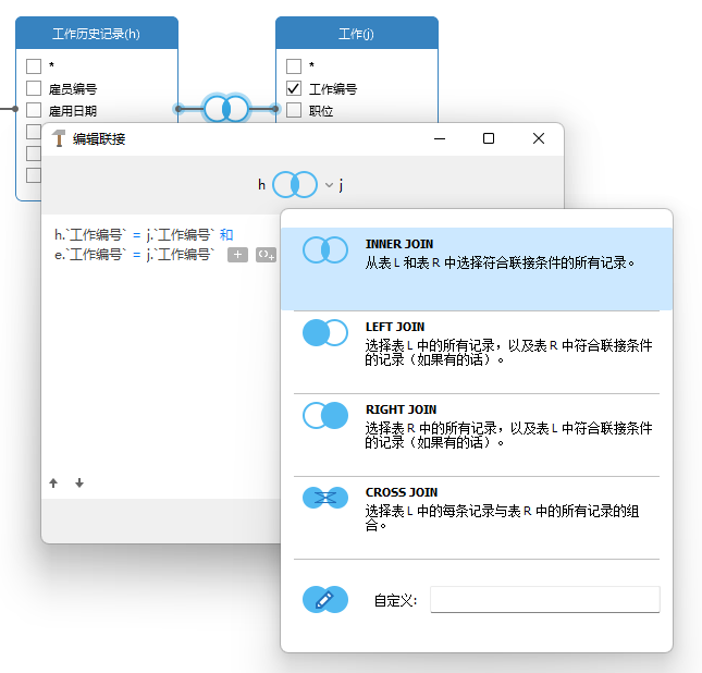 若要修改联接条件,请右键单击连接线,然后选择“编辑联接”,或在“FROM”选项卡上点击条件。