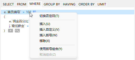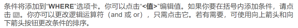 当检索数据时,你可能需要设置一个筛选表达式。若要筛选查询返回的数据,请右键单击图表窗格中的字段,然后选择“添加字段到”->“WHERE”和一个运算符。