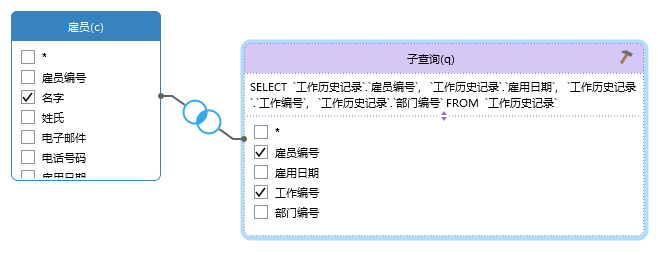 查询创建工具有两种视图显示连接线:表关系和字段关系。“字段关系” 视图可让你识别两个表中匹配的字段,而“表关系”视图可显示两个表之间的联接关系。