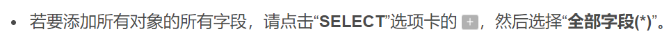 已选择的字段会显示在“SELECT”选项卡。你可以在那里指定其他输出字段选项。