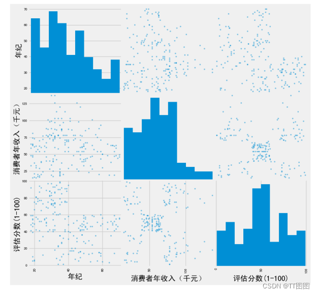 先导入相关的Python库和数据集,示例的数据集包括客户ID,性别,年龄,年收入,消费评估分数。