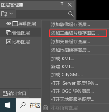 在左下角图层管理器中,找到普通图层并右键,选择添加三维切片缓存数据·,如果有其他类型的三维数据可以选则其他选项,找到模型文件并加载(三维切片缓存数据的元文件后缀是scp),加载之后双击图层就可以定位到模型所在位置。