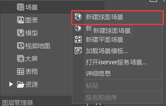 在左侧工作空间管理器中找到场景,并右键,选择新建球面场景,之后即可看到工作空间中出现了地球画面
