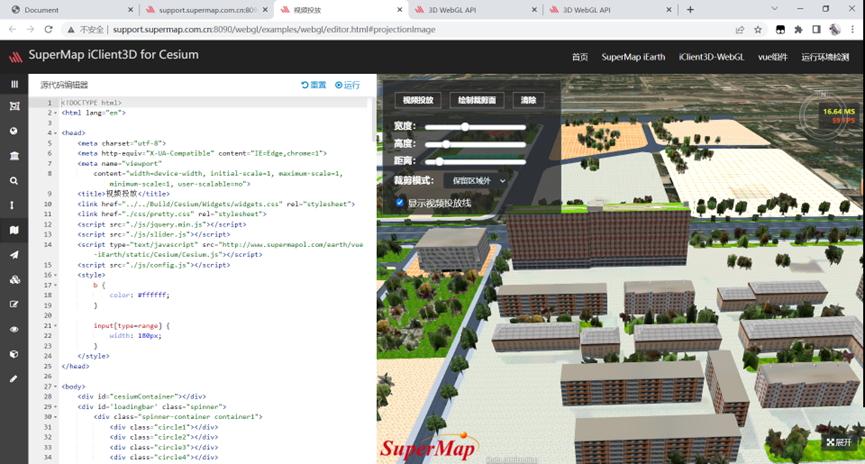 在自己书写代码之前可以在官网http://support.supermap.com.cn:8090/webgl/examples/webgl/editor.html#projectionImage进行练习