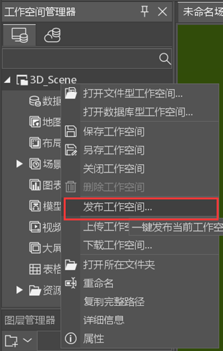 回到SuperMap iDesktopX 11i,打开创建好的的场景,右键左侧工作空间管理器中的工作空间名称,选择发布工作空间,